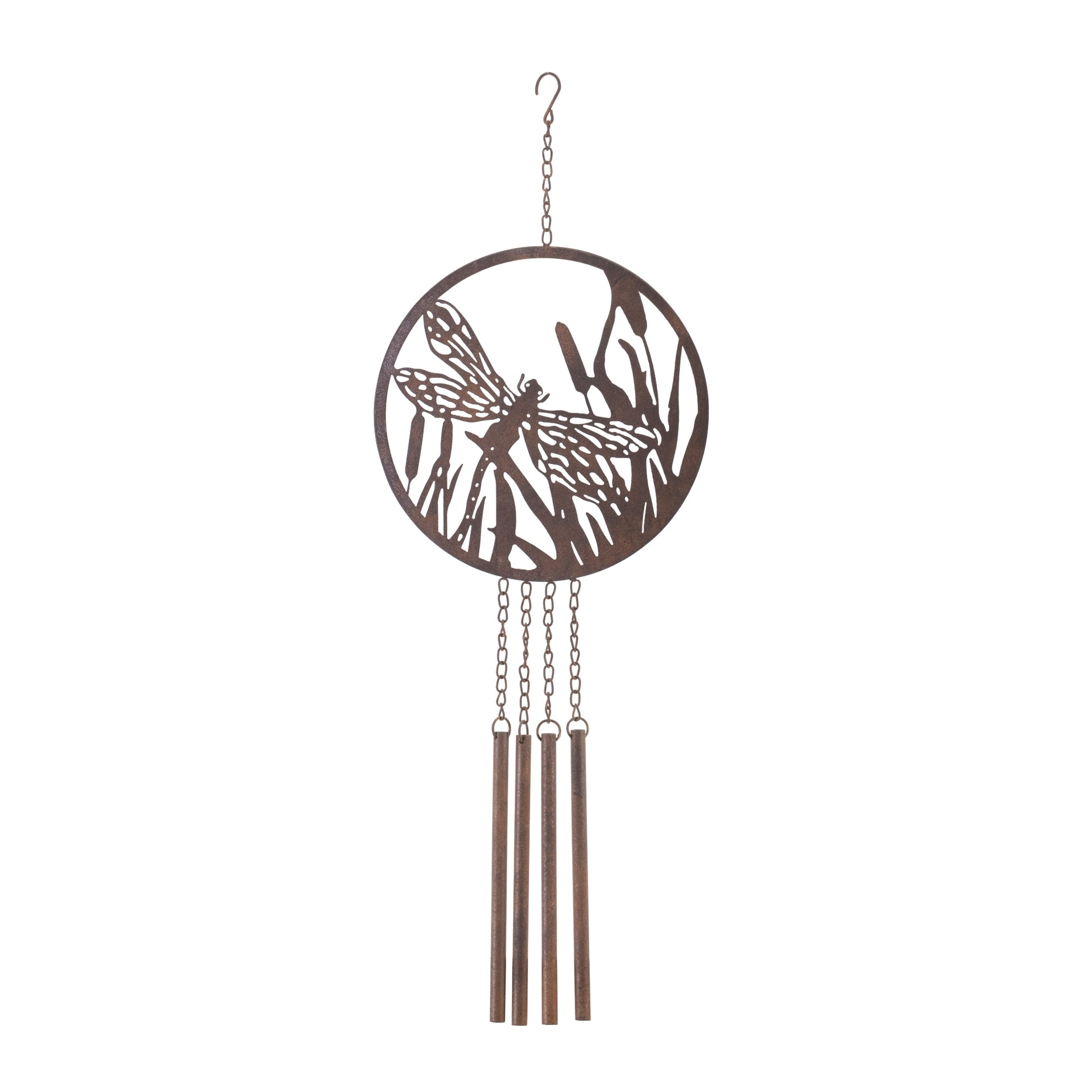 Adorn your yard with this adorable Dargonfly Wind Chime. Measuring 33" tall, this piece is sure to bring a whimsical touch to your spring and summer outdoor decor. The quality iron metal composition paired with the distressed bronze finish and delicate cut-out dragonfly insect and pond cattail accents, is the perfect combination to create a memorable display. With a chain for easy hanging, display this piece on your porch or patio to share the beauty and musical chimes will your visitors.