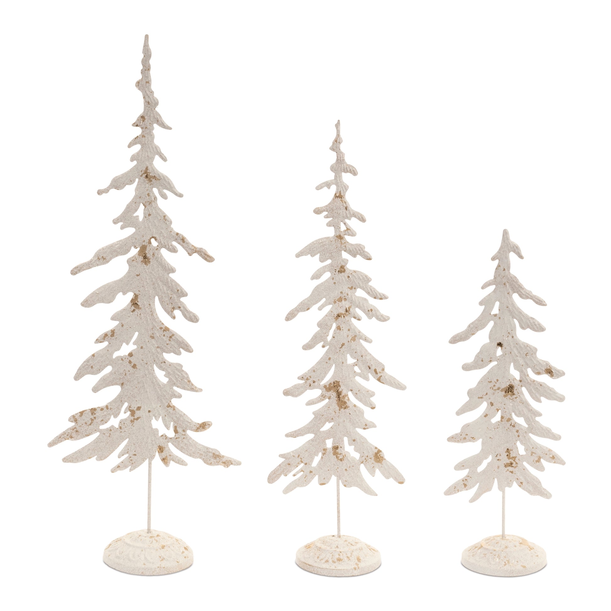 Add a natural elemant to your winter decor with this stunning set of Metal Pine Trees. Featuring three assorted sizes, this set is a great fit for your rustic woodland or lodge cabin style of holiday decor. The white washed finish with chic gold accents is the perfect combination to create a memorable display. The quality metal composition is sure to endure for seasons to come. Display the pieces on your mantle or bookshelf to make a statement, or gift them to someone special to spread the holiday cheer.