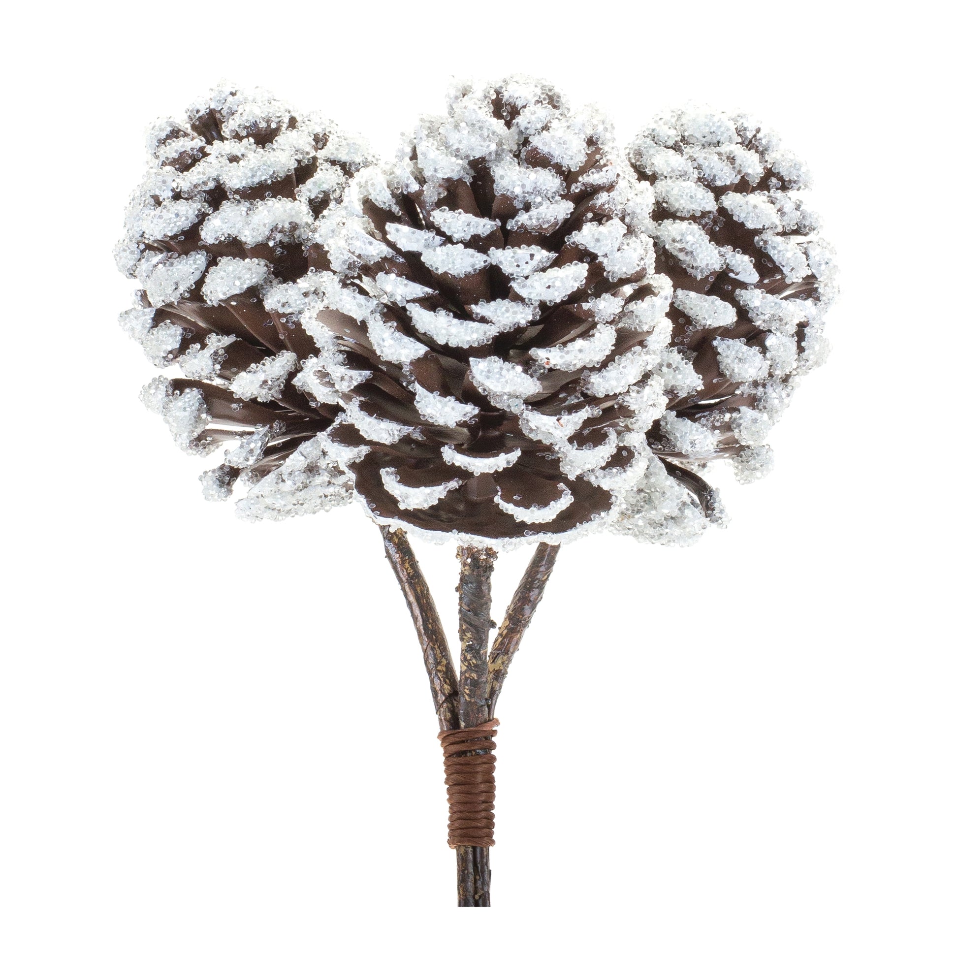 Add a touch of nature to your home with this stunning set of Flocked Pine Cone Bundles. The natural brown tones paired with the pinecone cluster design and snowy flocked finish are the perfect combination to create a memorable holiday display. Display the bundles in a tabletop vase to add height to your decor, or place them into a garland or wreath to accent the arrangement. Whether you're adding a touch of cheer to your home or gifting to a loved one, these pieces will definitely bring smiles to your home.