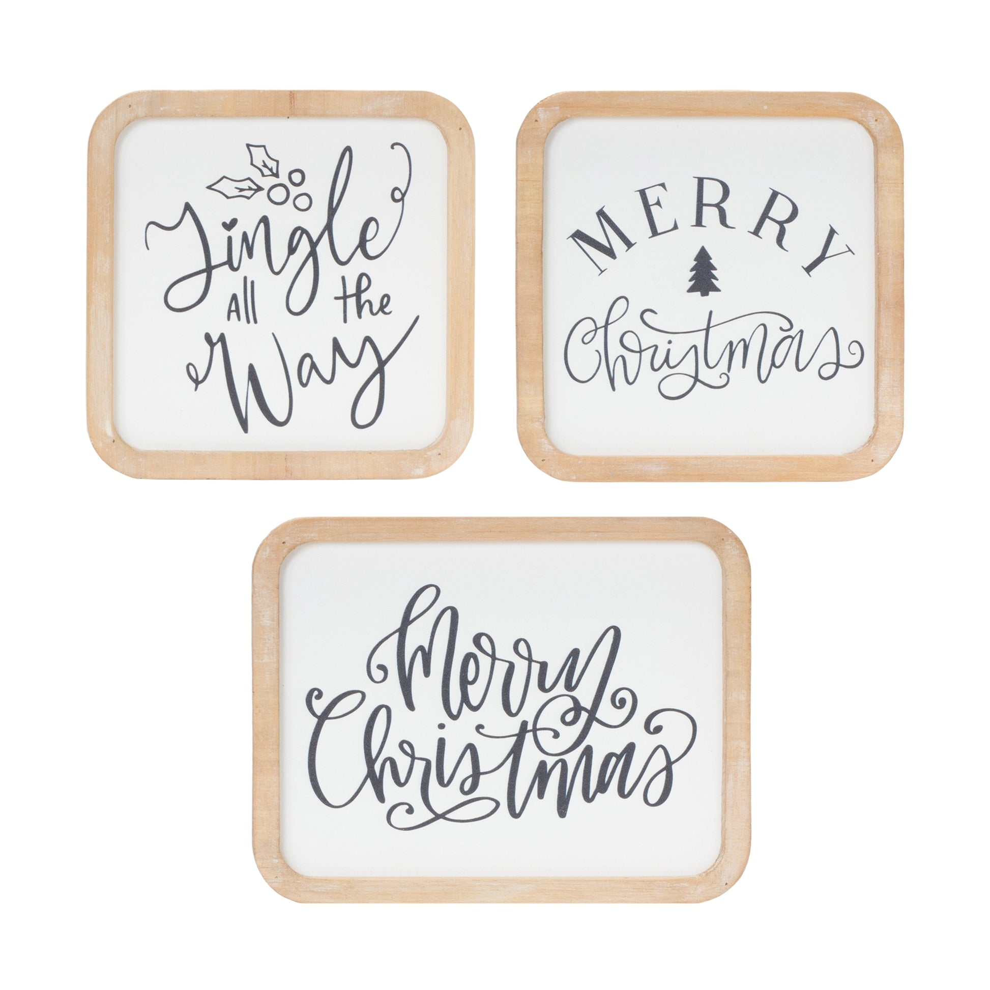 Get your home into the holiday spirit with this set of Holiday Sentiment Plaques! The elegant and festive wall plaque will bring warmth and holiday cheer to any room. With its neutral white and black tones and elegant cursive font, you can share the message of "Jingle All the Way" and "Merry Christmas" with your loved ones. The MDF wood composition and natural wood frame ensures a durable yet lightweight piece that will last for years to come. Add some holiday cheer to your home today with Holiday Sentiment Signs!