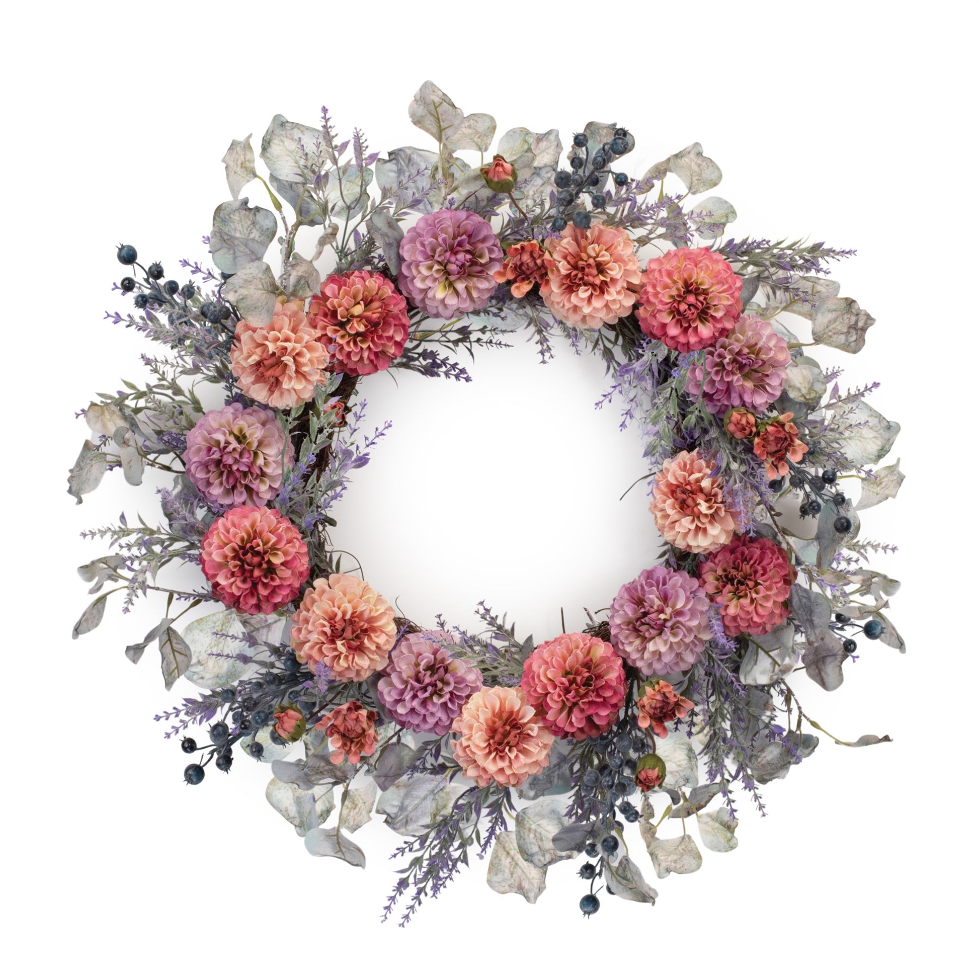 Let the sun shine in with the Mixed Zinnia Floral Wreath. Add a touch of nature to your home with this beautiful wreath, featuring soft pink and purple floral tones, quality grapevine twig base, and berry accents. Crafted from quality polyester fabric and plastic, this wreath is sure to bring a warm and cheerful atmosphere wherever you place it! Adorn your front door or entryway to welcome guests with this beautiful floral wreath today!